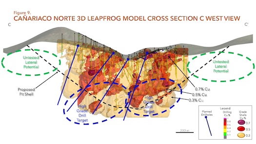 El modelado geológico de 2024 ha identificado varias zonas de cobre de alta ley con posibles extensiones de profundidad no probadas previamente. Estas zonas, así como las zonas internas, donde la perforación de relleno podría expandir algunas zonas de alta ley, se someterán a pruebas de perforación con el objetivo de mejorar aún más los importantes recursos minerales actuales ya definidos en Cañariaco.